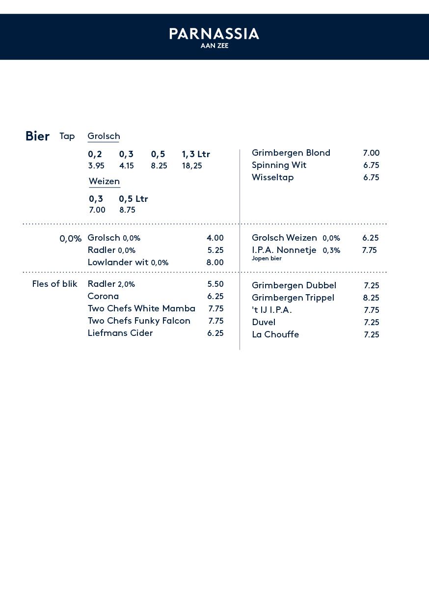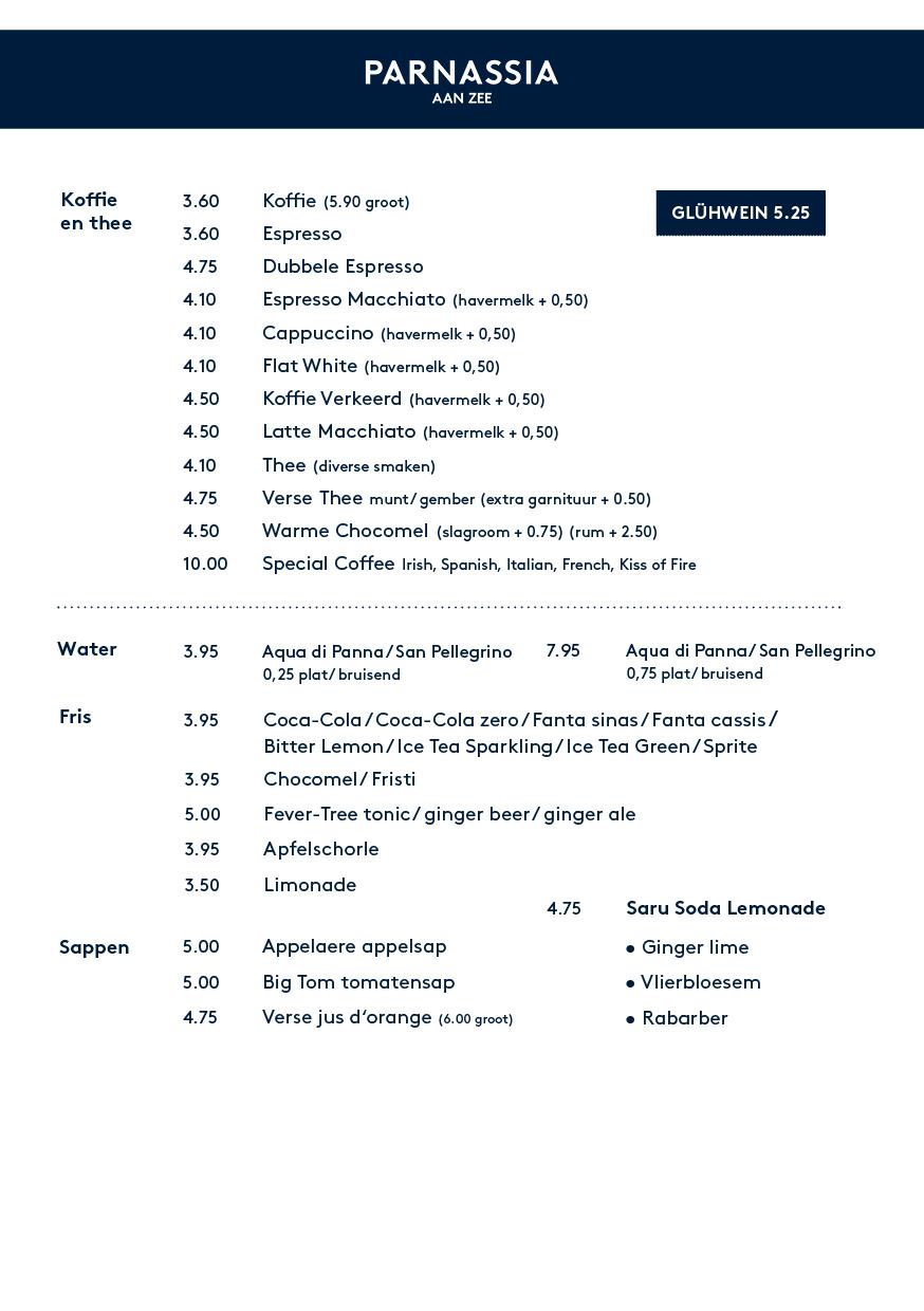 Van dagjes mensen, vaste gasten tot koninklijk bezoek, iedereen voelt zich thuis en heeft een verhaal met Parnassia. Omdat het paviljoen zich midden in een natuurgebied bevindt sluiten we elke dag als de zon ondergaat. Dat betekent dat de sluitingstijd dus wisselend is. Let op! De keuken van ons restaurant sluit altijd een uur voordat de zon ondergaat.